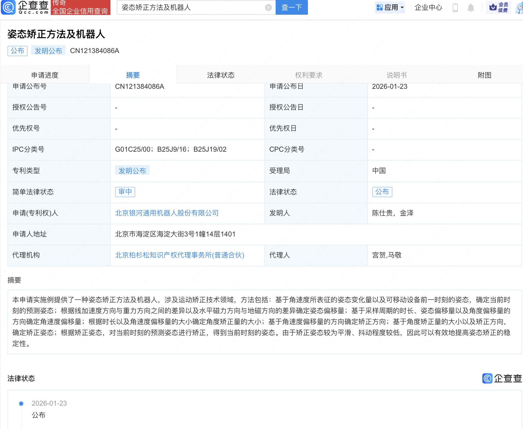 近日,北京银河通用机器人股份有限公司“姿态矫正方法及机器人”专利公布。企查查专利摘要显示,本申请涉及运动矫正技术领域中利网,方法包括:基于角速度所表征的姿态变化量以及可移动设备前一时刻的姿态,确定当前时刻的预测姿态;根据线加速度方向与重力方向之间的差异以及水平磁力方向与地磁方向的差异确定姿态偏移量;基于采样周期的时长、姿态偏移量以及角度偏移量的方向确定角速度偏移量;根据时长以及角速度偏移量的大小确定角度矫正量的大小;基于角速度偏移量的方向确定矫正方向;基于角度矫正量的大小以及矫正方向,确定矫正姿态;根据矫正姿态,对当前时刻的预测姿态进行矫正,得到当前时刻的姿态。由于矫正姿态较为平滑、抖动程度较低,因此可以有效地提高姿态矫正的稳定性。